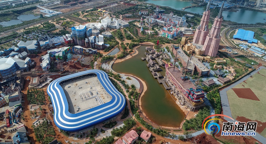 長影海南“環球100”電影主題樂園一期占地面積837畝,目前已經完成90%以上。海報全媒體中心記者袁琛 攝