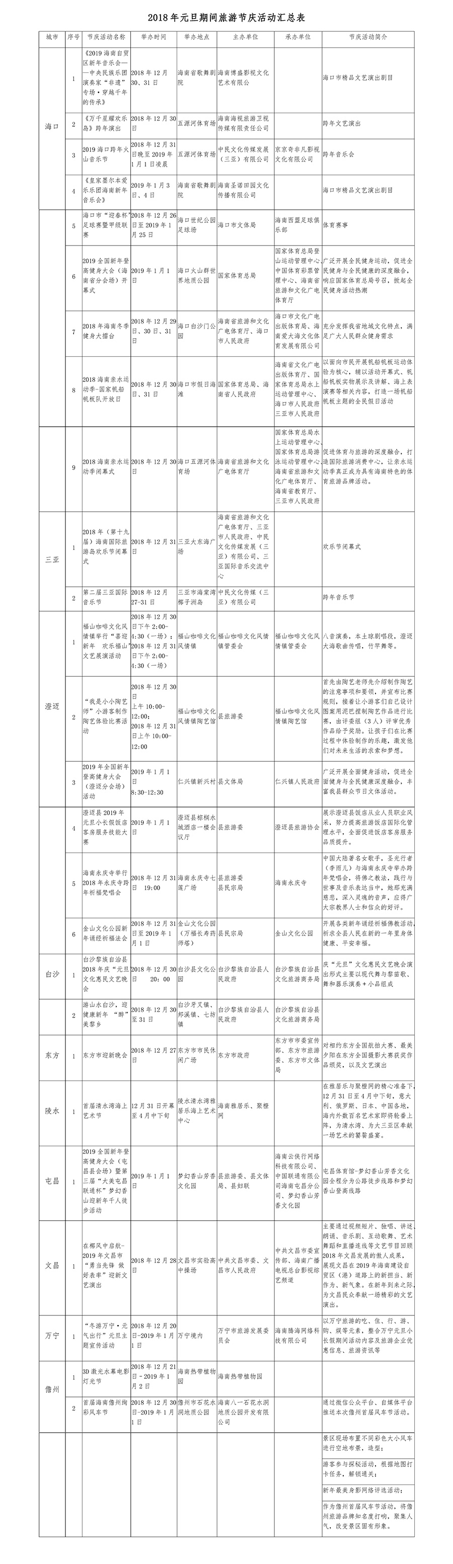 元旦期間,各市縣假日活動也精彩紛呈。海口向島內外游客推出了中央民族樂團演奏家“非遺”演奏會專場、皇家墨爾本愛樂樂團新年音樂會、2018年海南冬季健身大擂臺等活動;澄邁將舉行福山咖啡文化風情鎮的“喜迎春 歡樂福山”文藝展演活動、2019年全國新年登高健身大會(澄邁分會場)活動;陵水黎族自治縣將舉行首屆清水灣海上藝術節,意大利、俄羅斯、日本及海內外數百名藝術家將輪番登場,奉獻出一場國際藝術盛典;萬寧將推出吃、住、行、游、購、娛等元素相結合的“冬游萬寧·元氣出行”元旦主題宣傳活動,帶領游客體驗萬寧的魅力;儋州將舉行3D激光水幕電影燈光節活動、首屆海南儋州絢彩風車節活動等。