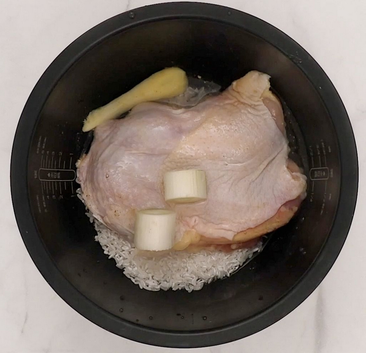 1大米洗凈,把去骨的雞腿放入,再放一片姜、2段蔥、少許鹽和白胡椒粉、140g水。選擇煮飯模式。賣肉的地方基本都能給雞腿去骨。