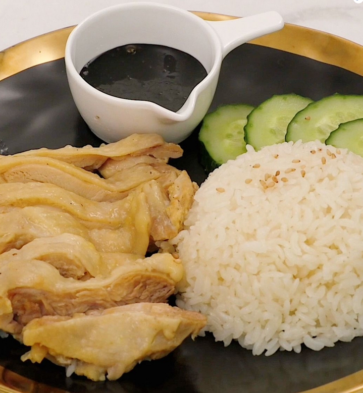 3 飯煮好以后,取出雞腿切塊兒,配著醬汁一起食用。