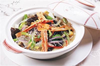 齋菜煲,此菜的美味和經典傳承,幾乎可以稱為海口的美食名片。鐘情此菜的內地顧客比比皆是,本地人逢年過節更是少不了齋菜煲。瓊菜泰斗、海南烹飪界“陳師門”掌門人陳中琳介紹說,做地道齋菜煲有11種食材,不能用葷油高湯。如果您吃到的不是這樣,對不起,您可能遇到山寨貨了,請記住這段口訣:甜菜水芹黃豆腐,冬菇發菜炸腐竹,黑豆芽、黑木耳,蕎頭粉絲金針菇,祭祖拜公最傳神,素油菌湯一鍋煮。