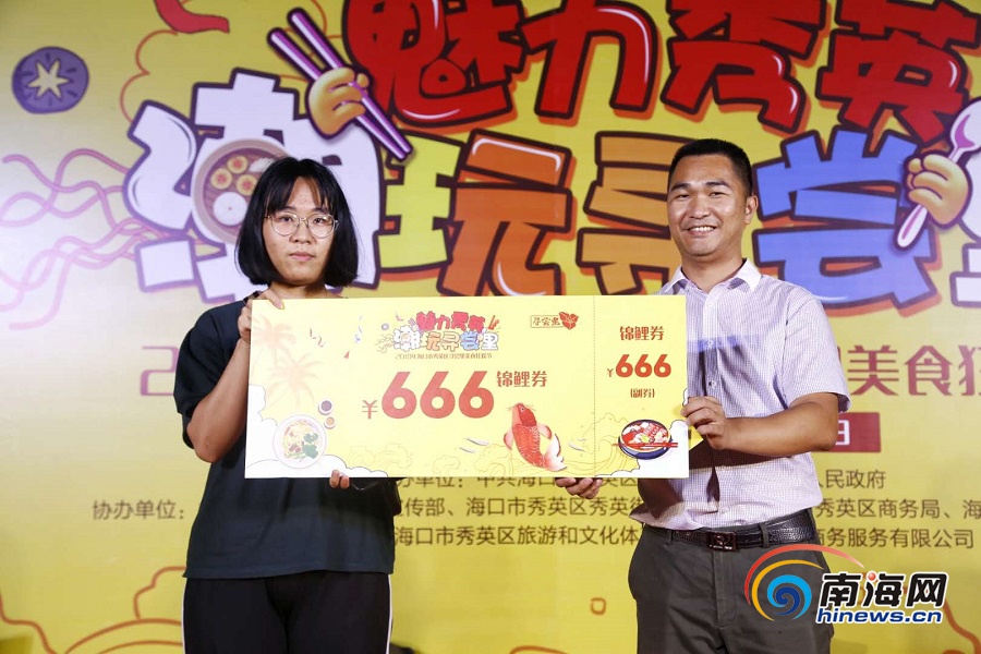2019尋嘗里美食狂歡節,一位幸運市民(左)獲得價值666元的錦鯉券。南海網記者 姚皓 攝