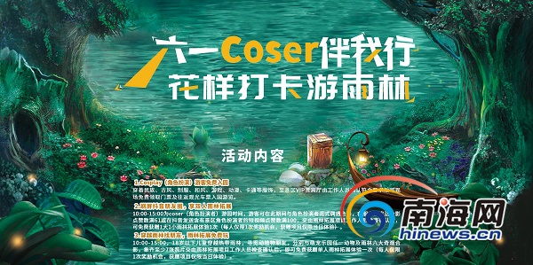 海南旅游頭條、南海網、南海網客戶端海口5月28日消息(南海網記者孫令正 通訊員葉玉琪)小童大夢想,大童小時憶。今年“六一”國際兒童節,為打造獨特雨林節慶、營造歡樂游園氛圍,呀諾達雨林文化旅游區將推出以“花樣打卡游雨林 六一coser伴我行”為主題的cosplay(角色扮演)游園活動,邀請大小朋友參加。