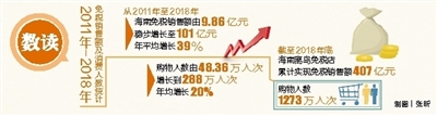 吸引力越來越強的免稅購物政策,帶來的是直觀的銷售額和消費人數提升:從2011年至2018年,海南免稅銷售額由9.86億元穩步增長至101億元,年平均增長39%;購物人數由48.36萬人次增長到288萬人次,年均增長20%。截至2018年底,海南離島免稅店累計實現免稅銷售額407億元,購物人數1273萬人次。
