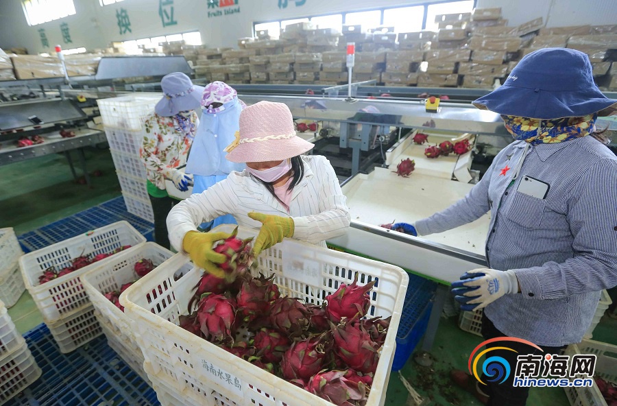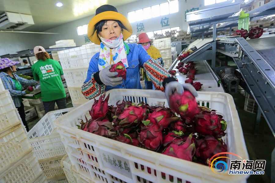 海南旅游頭條、南海網、南海網客戶端海口(海報集團全媒體中心記者 陳元才 見習記者 李天平)近日,在東方市板橋鎮的水果島東方火龍果(板橋)基地,工作人員正在將火龍果打包運往全國各大批發市場,時下,該品牌火龍果在全國各地熱銷,供不應求。
