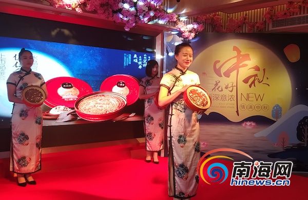 品鑒會現(xiàn)場,禮儀小姐展示今日上市的水晶宮五仁金腿大月餅。南海網(wǎng)見習(xí)記者韓星攝