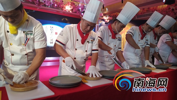 月餅品鑒環(huán)節(jié),水晶宮酒樓的師傅們來到舞臺前方,共同為賓客分切月餅。南海網(wǎng)見習(xí)記者韓星攝