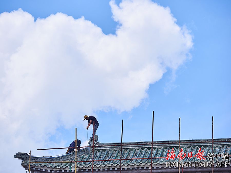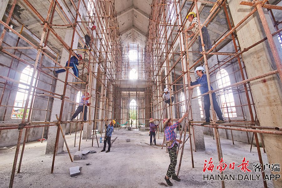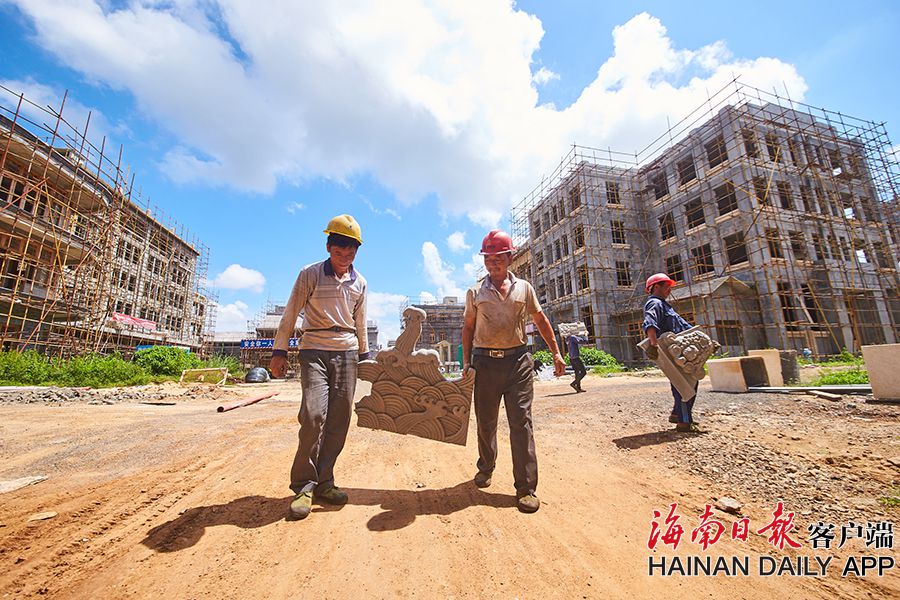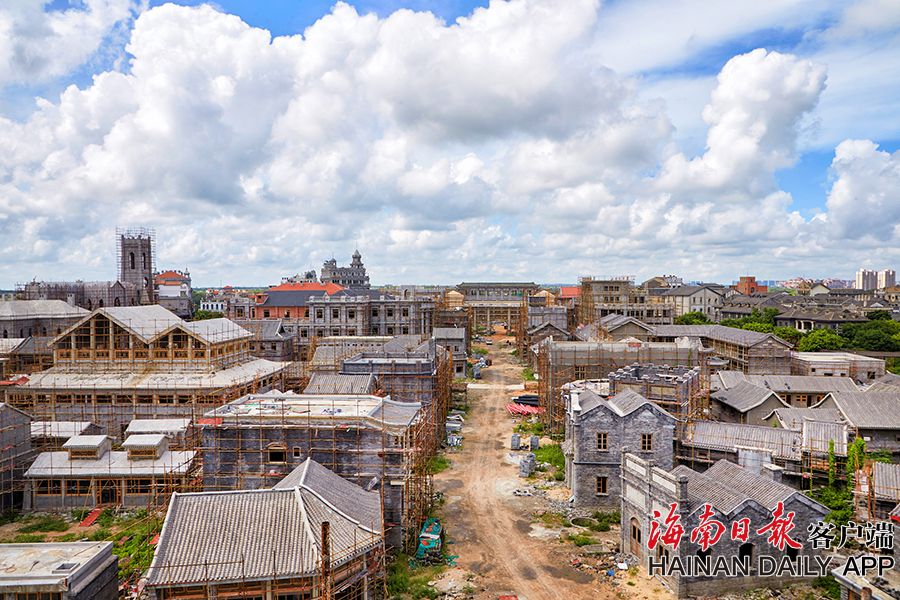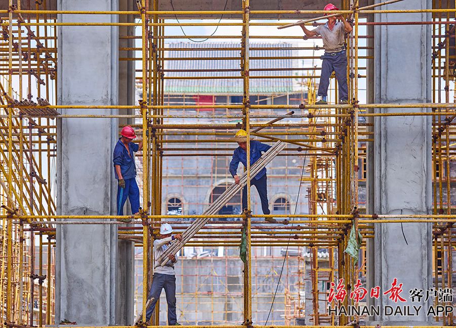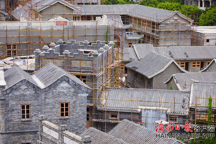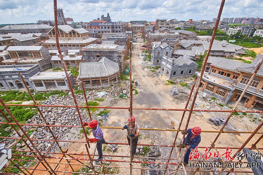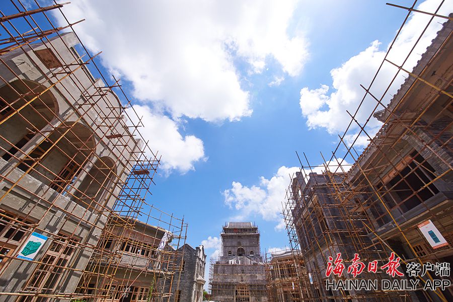 2019年8月28日,海口觀瀾湖電影公社老北京風情街施工現場,工人們正搭設鋼架,以進行隨后的立面裝飾工作。 據了解,電影公社老北京風情街現已完成建筑砌體及抹灰工程,目前主要進行建筑外立面裝飾工作,進度已達70%,并計劃于2020年6月30日前完成整體園林及綠化工程,具備開放展示條件。圖為:電影公社老北京風情街施工現場全貌。(海南日報 見習記者 封爍 攝)