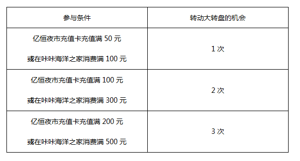 10月1日至7日,凡在億恒夜市服務中心辦理充值卡,或在咔咔海洋之家消費,即可憑小票或收據現場參與歡樂大轉盤。(小票僅限當天有效)