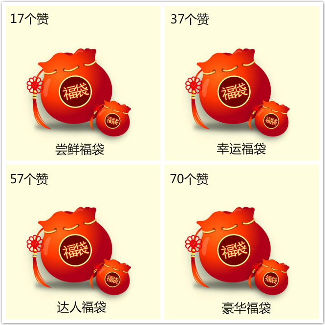 不同數量的贊,有不同價值的福袋。每日福袋數量有限,速速讓親朋好友助力,搶先領取福袋吧!(領取地點:億恒夜市服務中心)