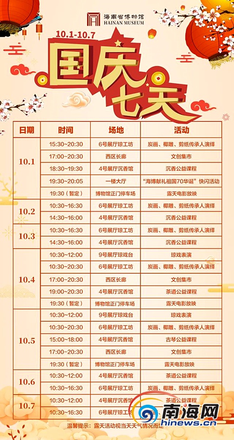 在10月4日、5日10時30分-12時,海南省博物館還將舉辦“與國同慶·瓊臺觀戲”活動,吸引市民來海博瓊戲臺聽海南故事、看瓊劇、品老爸茶。