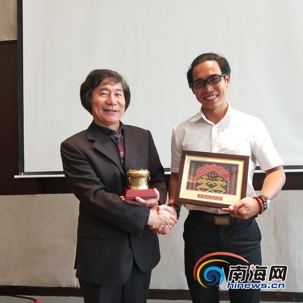 海口市旅文局副局長張昆榮和越南旅行商代表互換禮物。南海網記者 蘇靚 攝