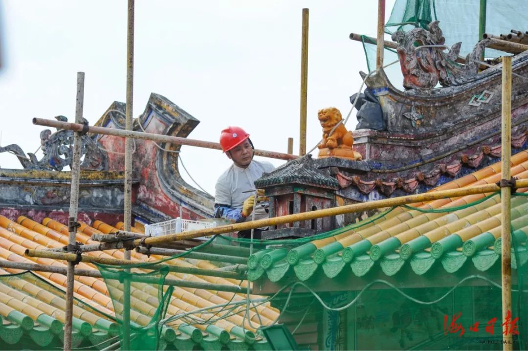工人師傅為特色民居進行外墻裝修。海口日報記者 王程龍 攝