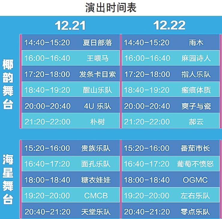 據介紹,參加此次音樂節的22組國內知名音樂人的演出時間已公布,12月21日演出的有夏日部落、王喂馬、發條卡目索、醒山樂隊、4U樂隊、樸樹、貴族樂隊、面孔樂隊、糖衣娃娃、CMCB、天堂樂隊等。12月22日演出的有雨木、麻園詩人、指人樂隊、瘢痕體質、爽子與瓷、郝云、番茄市長、葡萄不憤怒、OGMC、左右樂隊、零點樂隊等。樂迷可根據自己的購票情況,在對應時間里為自己喜愛的歌手和樂隊喝彩。