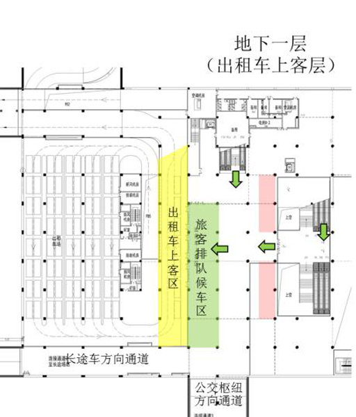 前往海汽客運(yùn)總站的出租車(chē)和從海汽客運(yùn)總站地下車(chē)場(chǎng)入口駛?cè)耄诘叵萝?chē)場(chǎng)落客后待客或直接離場(chǎng),旅客下車(chē)后通過(guò)地下通道出口到達(dá)海汽客運(yùn)總站地面廣場(chǎng)。