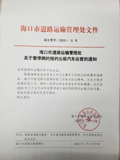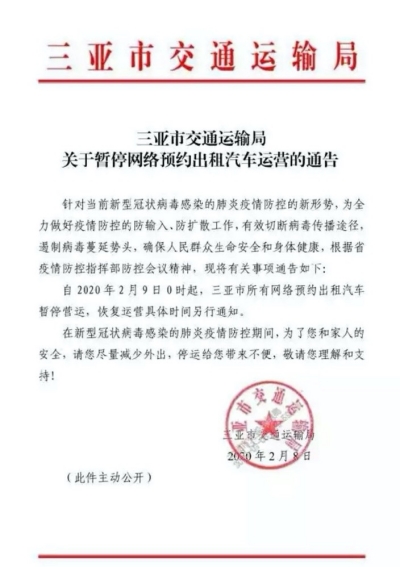 2月8日,??谑械缆愤\輸管理處發布通知,決定自2月9日0時起暫停海口地區網約車運營,恢復時間另行通知。同天,三亞市交通運輸局發布《關于暫停網絡預約出租汽車運營的通告》。通告指出,自2020年2月9日0時起,三亞市所有網約車暫停運營,恢復運營具體時間另行通知。