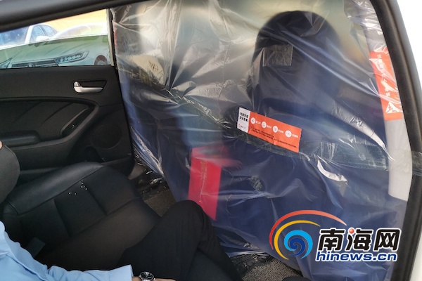 2月14日起,滴滴在海口啟動車內后排防護隔離膜的安裝,在網約車內再帶上一層“透明口罩”。滴滴出行供圖