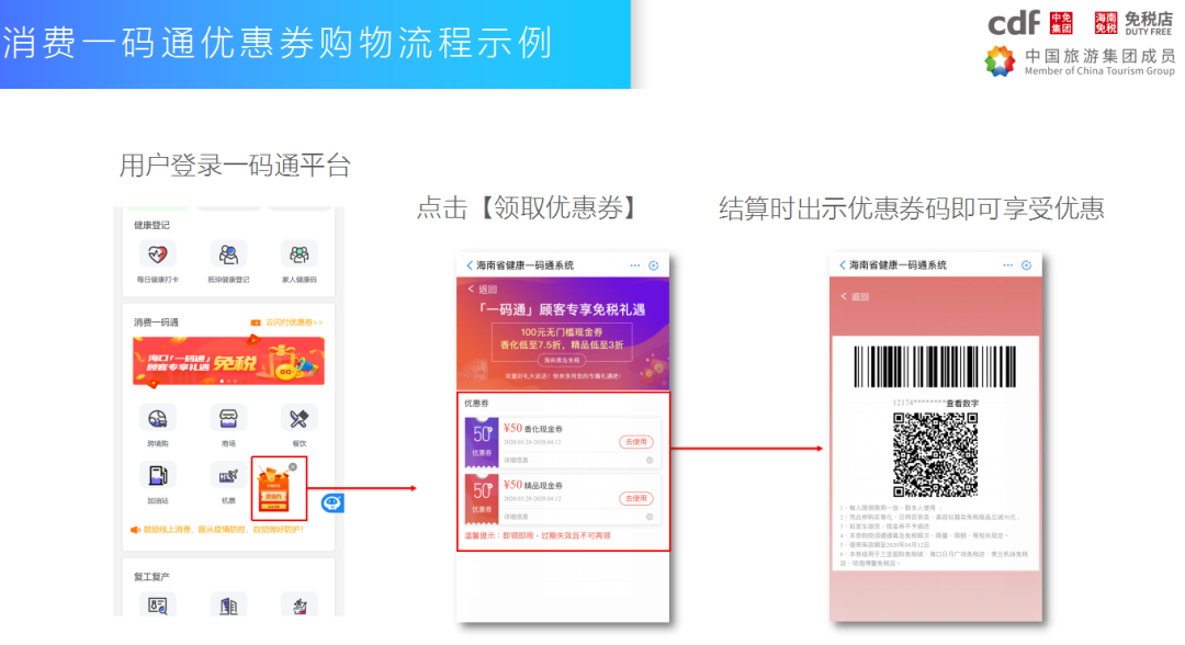 當(dāng)天,中免集團(tuán)、中國(guó)石化、中國(guó)銀聯(lián)、海南航空以及省內(nèi)餐飲、商場(chǎng)、便利店等各類(lèi)商家將通過(guò)“消費(fèi)一碼通”發(fā)放約3000萬(wàn)元優(yōu)惠券,省內(nèi)外居民在登錄后每人可領(lǐng)取210元消費(fèi)券大禮包,其中包括100元免稅現(xiàn)金券、20元跨境購(gòu)消費(fèi)券、70元中石化消費(fèi)券以及20元航空消費(fèi)券。消費(fèi)券不僅可以在線上購(gòu)物,還可在實(shí)體店付款時(shí)抵扣,滿(mǎn)足廣大消費(fèi)者的購(gòu)物消費(fèi)需求。