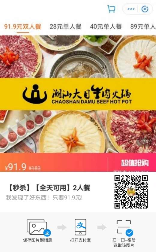 一、打開支付寶APP【口碑】搜索“潮汕大目牛肉火鍋”,進入商家頁面,即可購買到40元代100元的代金券,每桌限用一張。