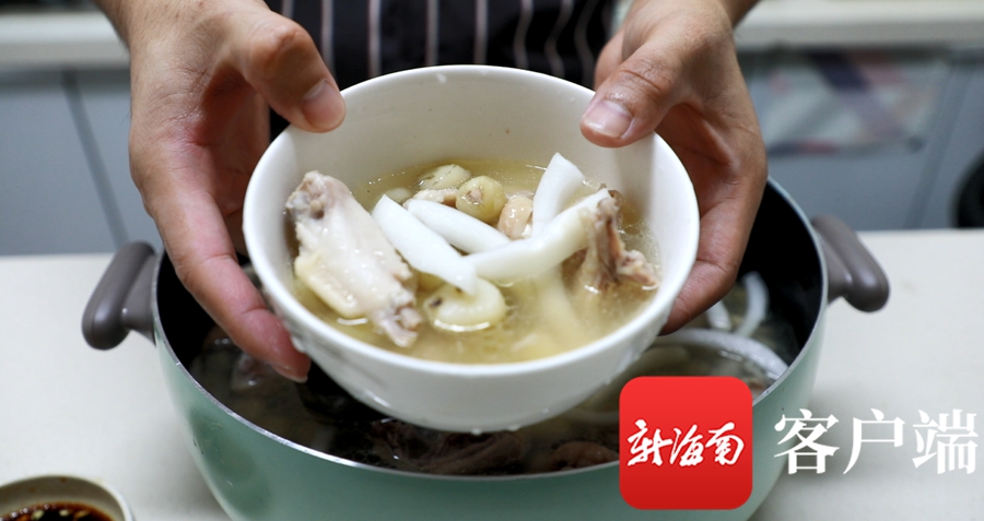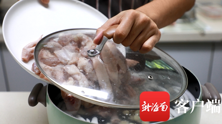 先將椰子肉、馬蹄等配料放至鍋中煮,待水沸騰后,再將文昌雞倒入其中。記者 吳興財(cái) 攝