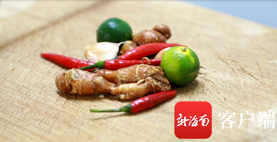 文昌雞、椰子水、小瓶醬油、椰子肉、馬蹄等配料,以及小青桔、辣椒等調(diào)料,都是海南椰子雞必不可少的配料。記者 吳興財(cái) 攝