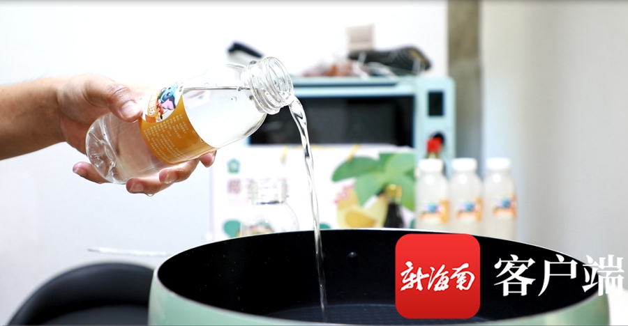將解凍后的椰子水倒入鍋中。記者 吳興財(cái) 攝