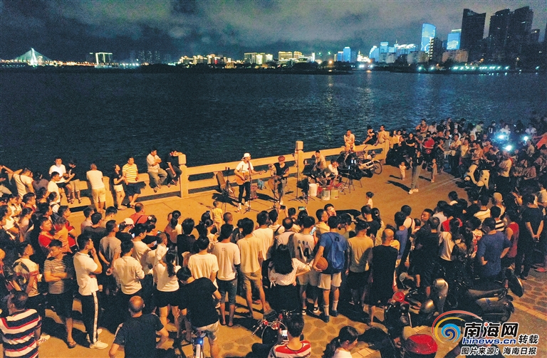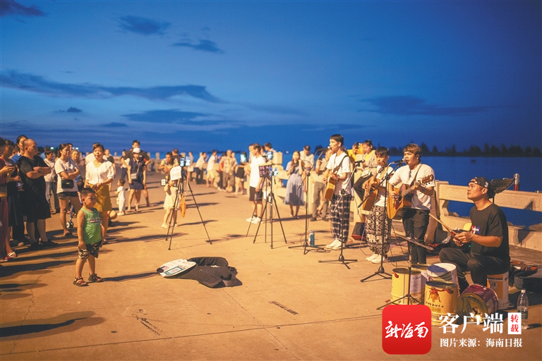 音樂舞蹈愛好者們匯聚海口灣,為市民獻(xiàn)藝,成為一道獨特的風(fēng)景線。