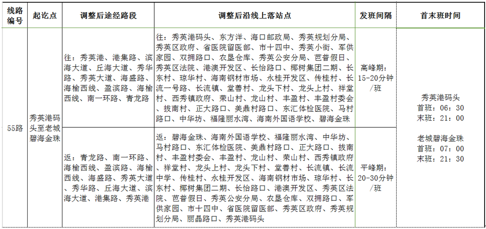 根據澄邁縣相關部門要求及市民建議,延長55路至老城碧海金珠。增加站點:碧海金珠、海南外國語學校、福隆麗水灣。55A線路號變更為55路,55B變更為55區間。