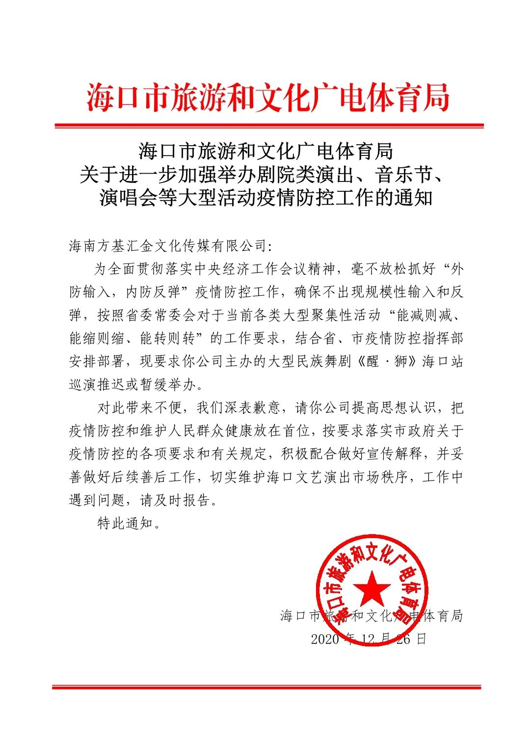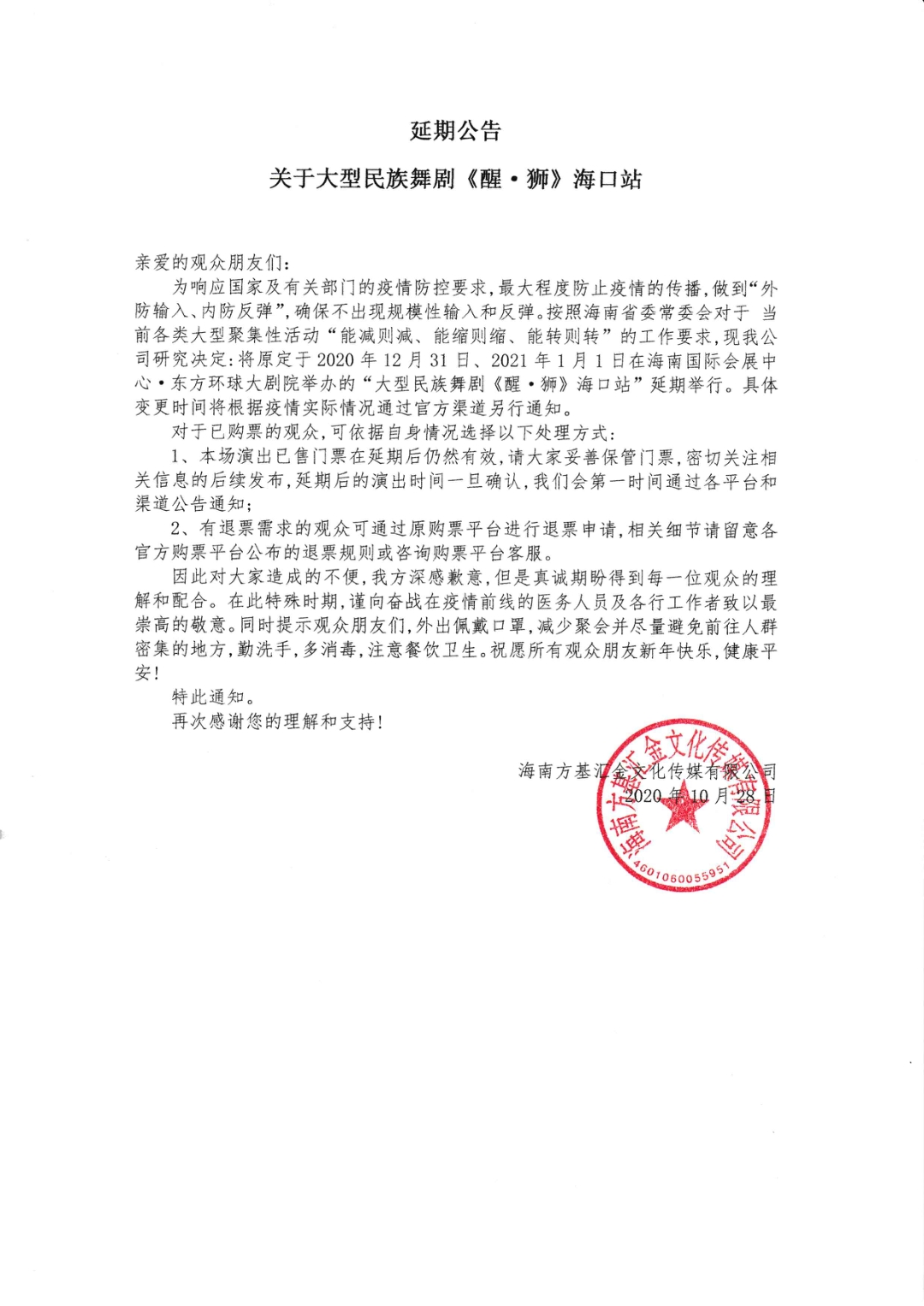 根據(jù)海口市人民政府防疫工作統(tǒng)一要求以及海口市旅游和文化廣電體育局《關(guān)于進(jìn)一步加強(qiáng)演出場(chǎng)所疫情防控工作的通知》文件指示,為更好保障所有觀眾及工作人員生命安全和身體健康,原定于2020年12月31日、2021年1月1日上演的大型民族舞劇《醒·獅》將延期演出,延期的演出我們將為觀眾提供退票服務(wù)。延期上演時(shí)間將另行通知。