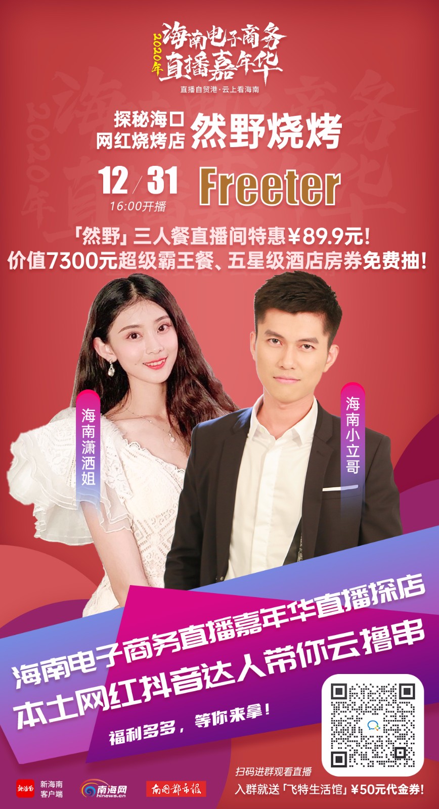 12月31日16時, 首期將由海南本土網(wǎng)紅抖音達人“海南瀟灑姐”“海南小立哥”化身美食達人,帶你探店這家位于海口華海路上的網(wǎng)紅燒烤店——然野燒烤,直播間不僅美食誘人,而且福利多多。