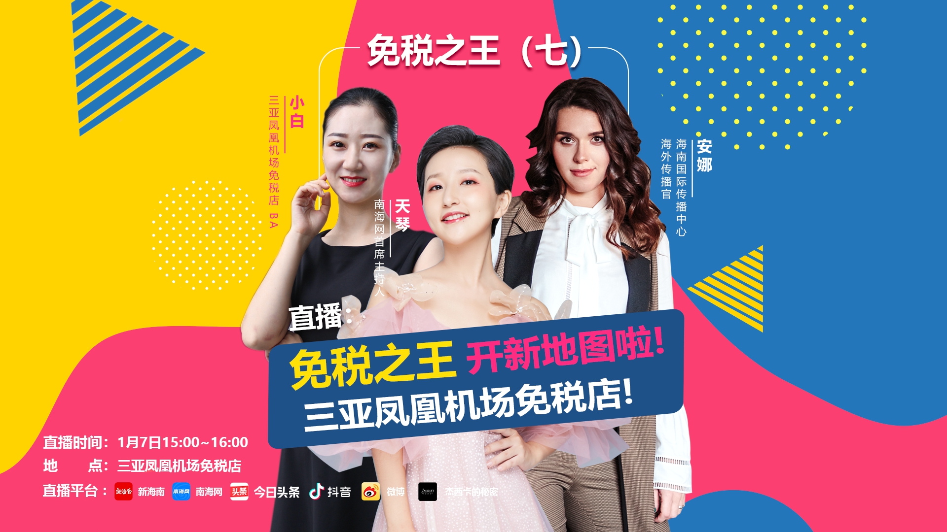 1月7日15:00至16:00,直播將在新海南客戶端、南海網(wǎng)、抖音、頭條、新浪微博、杰西卡的秘密等平臺(tái)進(jìn)行,主播天琴將攜手三亞鳳凰機(jī)場(chǎng)免稅店工作人員小白、海南國(guó)際傳播中心海外傳播官安娜,一起走進(jìn)免稅店,為您探訪最新的潮流免稅資訊,了解機(jī)場(chǎng)免稅店的購(gòu)物流程、環(huán)境等情況,快來(lái)關(guān)注直播間,留言參與互動(dòng)吧!