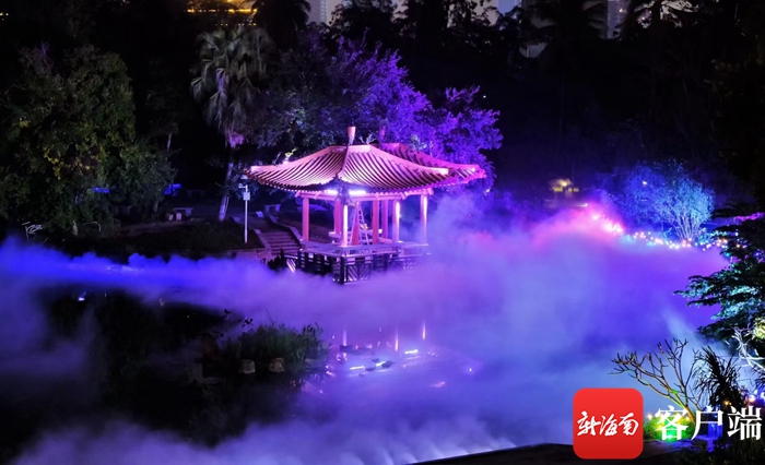 1月31日晚,記者在五公祠園區看見,亮燈一刻,全園燈光照亮了瓊臺福地的夜空,也照亮了五公祠內古色古香的文物古跡。五彩的燈光交織變換,水霧繚繞,猶若置身仙境。漫步在園區小路,感受清風徐來,看湖光相映、橋影波光,斑斕倒影搖曳水中,在光影中重溫歷史文化,在行游中享受探索之樂。古老的五公祠,在月夜下煥發著新生活力。