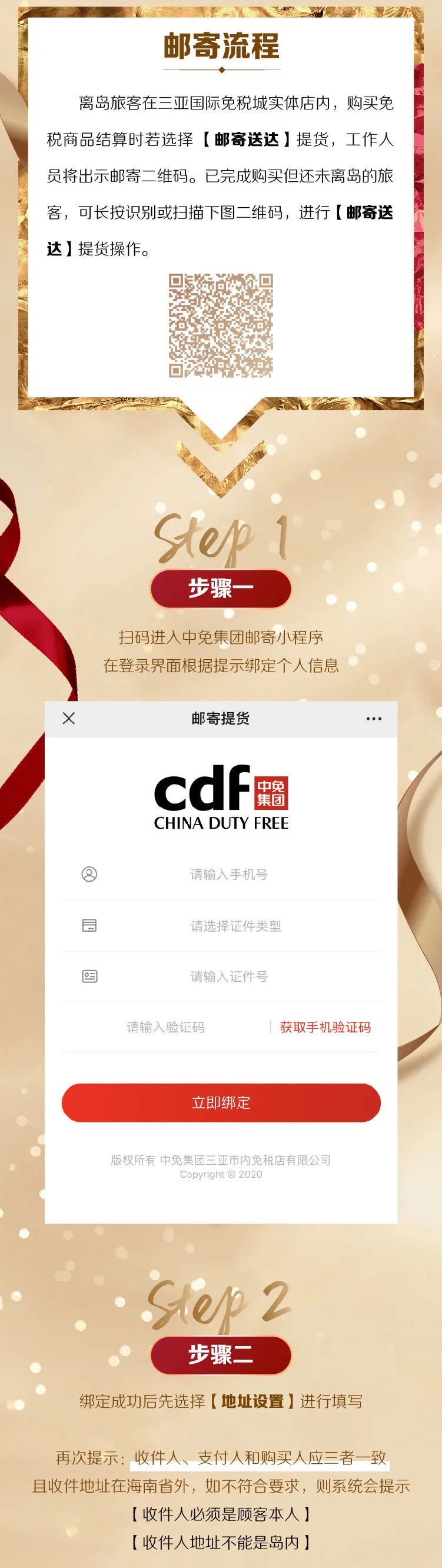 據悉,中國旅游集團旗下的cdf海口市內免稅店、cdf博鰲免稅店、cdf三亞國際免稅城郵寄手續一致,cdf??诿捞m國際機場免稅店、cdf三亞鳳凰機場免稅店則是“即購即提”。離島旅客在免稅店購物,若選擇“郵寄送達”提貨,工作人員將出示郵寄二維碼。已完成購物但未離島的旅客,可掃描指定二維碼,根據步驟提示進行提貨操作。旅客掃描二維碼進入中免集團郵寄小程序,綁定個人信息,綁定成功后選擇地址設置進行填寫,提交成功后,旅客需在離島時到提貨點再次核實郵寄信息。購買免稅品郵寄費用由中旅集團支付,通過中國郵政EMS保價郵寄。