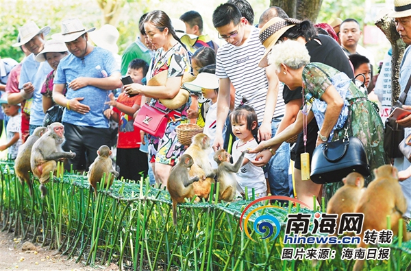 陵水南灣猴島生態(tài)旅游景區(qū),游客與野生獼猴親密接觸。海南日?qǐng)?bào)記者 王凱 攝