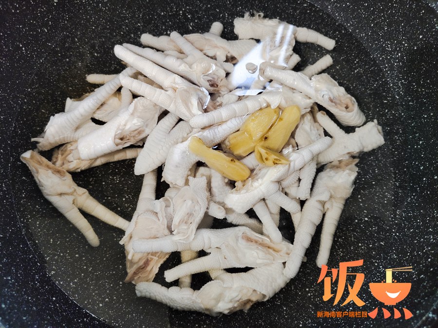 1、雞爪洗凈,冷水下鍋,加姜片料酒去腥,煮開后撈出浮沫,再次洗凈