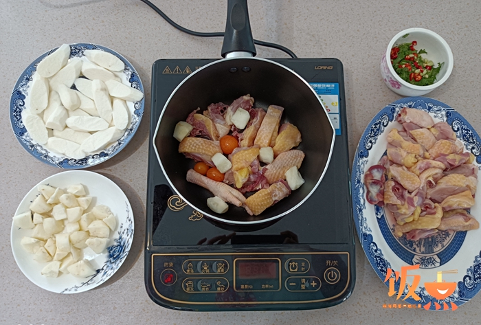 食材:生雞、馬蹄、山藥、椰肉、椰子水、小米椒、金桔、香菜