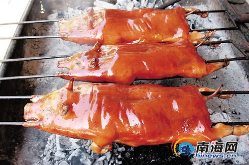 臨高乳豬以肉細(xì)、骨酥、味香而聞名,不管是烤、燜、炒、蒸都十分可口,但以燒烤最佳。烤一只乳豬約四五個(gè)小時(shí),烤出來的乳豬要全身焦黃、油光可鑒、散發(fā)著濃郁香味,那才算高手。