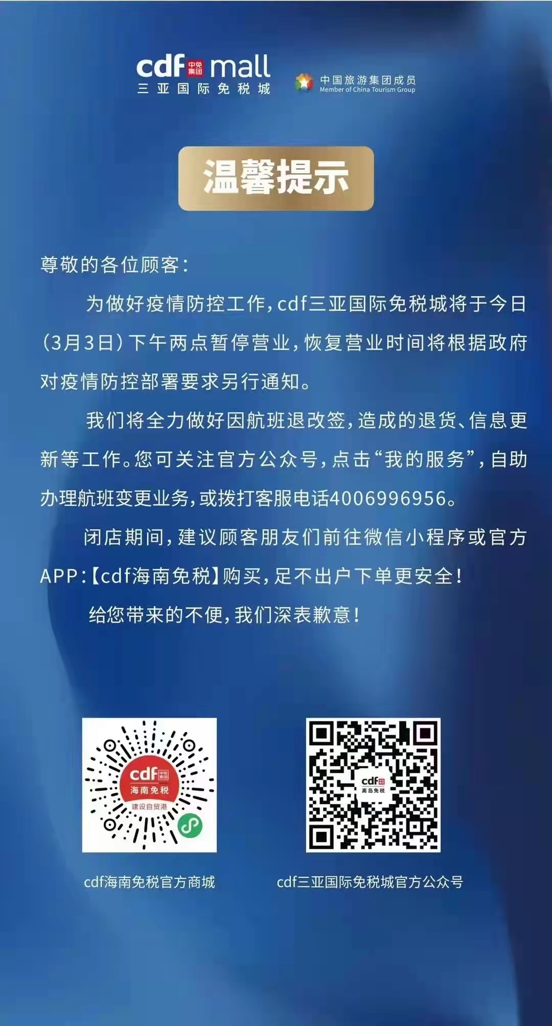 新海南客戶端、南海網(wǎng)、南國都市報3月3日消息(記者沙曉峰)3月3日,記者從三亞國際免稅城獲悉,接三亞市疫情防控及有關(guān)部門通知,因疫情防控需要,三亞國際免稅城3月3日14:00起暫停營業(yè),恢復(fù)營業(yè)時間另行通知。