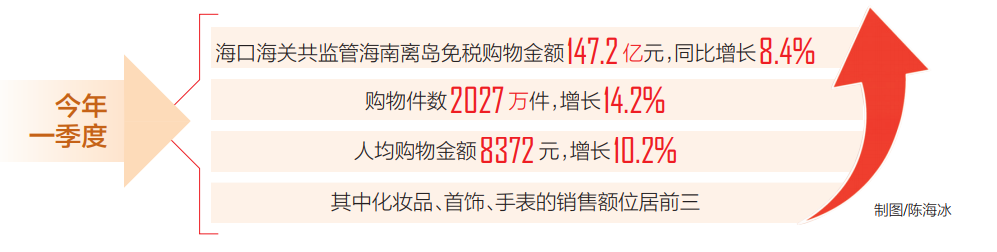 海南日報海口4月11日訊(記者周曉夢 通訊員張恒)海南日報記者4月11日從海口海關獲悉,據統計,今年一季度該關共監管海南離島免稅購物金額147.2億元,同比增長8.4%;購物件數2027萬件,增長14.2%;人均購物金額8372元,增長10.2%。其中化妝品、首飾、手表的銷售額位居前三。