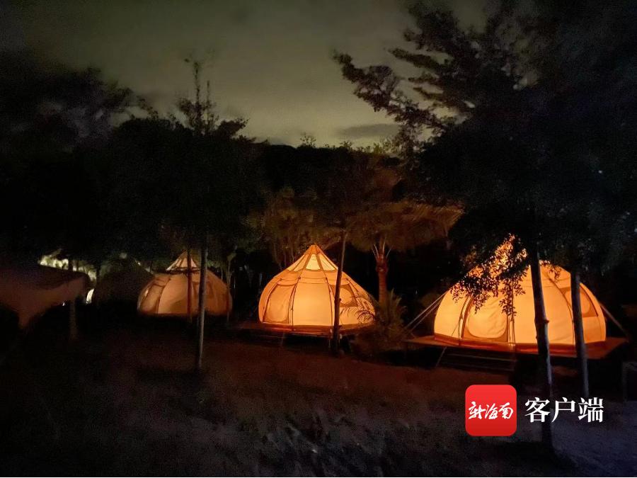 黎山麓營地是由王下鄉三派村合作社與云畫文旅公司共同設立,在村子游客中心搭建11頂帳篷。李海輝介紹,船型豪華帳融入海南黎族船型屋非遺文化,讓游客感受到少數民族的非遺魅力;星空帳篷頂部為透明的,游客可在屋內仰望星空,伴著夜色入眠。