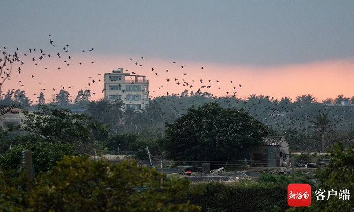 海南東寨港國(guó)家級(jí)自然保護(hù)區(qū)內(nèi),絲光椋鳥飛過夕陽(yáng)。記者 李昊 攝