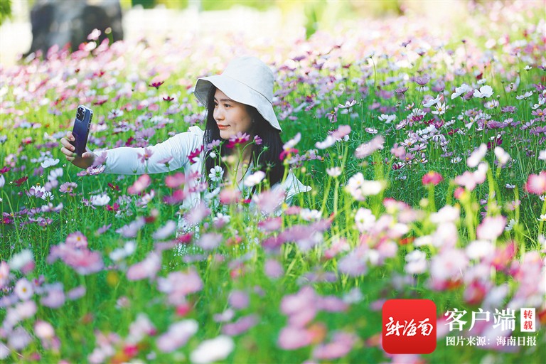 1月25日,游客在三亞南山文化旅游區(qū)花叢中自拍。 通訊員 陳文武 海南日報記者 王程龍 圖/文