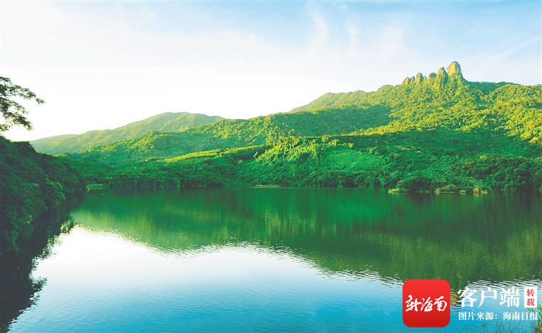 這是一張保亭七仙嶺的照片。碧玉般的湖水中倒映著翠綠的山,陽光下,山水泛出淡淡金光,十分美麗。