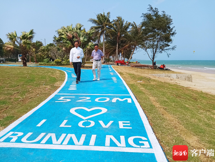 記者在博鰲濱海風(fēng)情街“海的故事”段看到,一條長1.8公里的健康跑道沿著海南旅游公路瓊海博鰲灣蜿蜒,至媽祖廟前廣場,藍(lán)色的跑道上標(biāo)著各式運(yùn)動圖案。