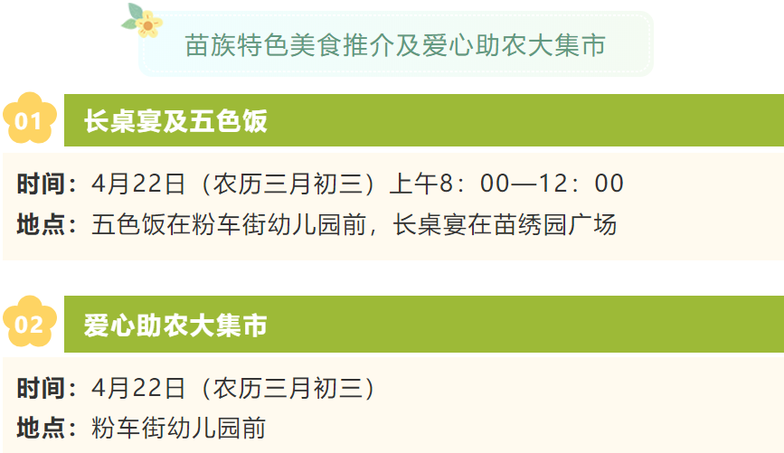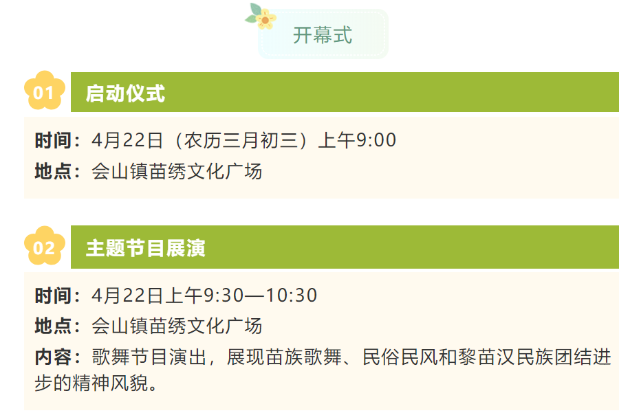 4月20日晚上,活動將首先在會山鎮(zhèn)苗繡文化廣場拉開傳統(tǒng)瓊劇會演,4月21日至22日,將舉行民族文藝表演、文藝晚會以及眾多民間競技活動和男子籃球半決賽、決賽。活動重頭戲開幕式將于4月22日(農(nóng)歷三月初三)上午9點在會山鎮(zhèn)苗繡文化廣場舉行。開幕式后將在現(xiàn)場舉行歌舞節(jié)目演出,展現(xiàn)苗族歌舞、民俗民風(fēng)和黎苗漢民族團(tuán)結(jié)進(jìn)步的主題節(jié)目展演。開幕式當(dāng)天還將舉行苗族特色美食推介及愛心助農(nóng)大集市,以及黎族苗族特色文化展、苗族文化交流會、政策宣傳活動展等豐富多彩的活動。