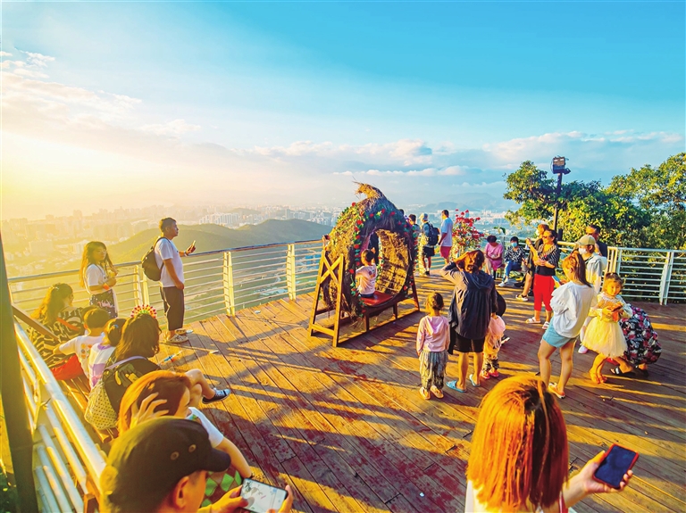游客在三亞鳳凰嶺海誓山盟景區觀看日落。