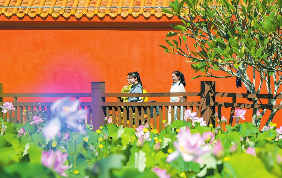 市民游客在美蘭區芳園國際藝術村棧道賞荷。海口日報融媒體記者 康登淋 攝